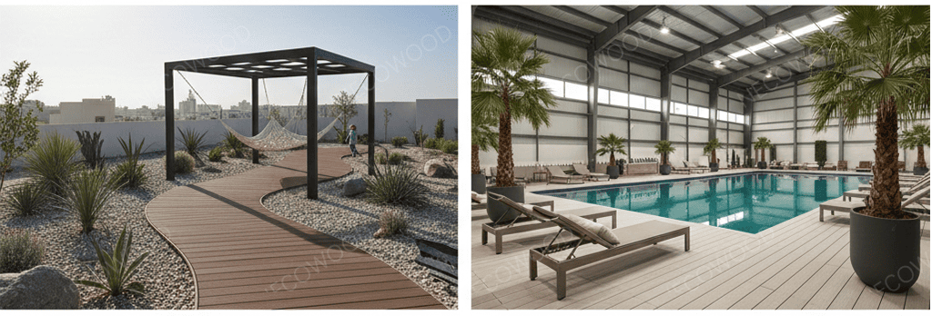 A NECOWOOD nagy teljesítményű termékeket gyártterasz fa műanyag kompozitkifejezetten a Közel-Keletre. Deszkáink fejlett fénystabilizátorokkal rendelkeznek, hogy biztosítsák a színek hosszú élettartamát magas UV-környezetben.